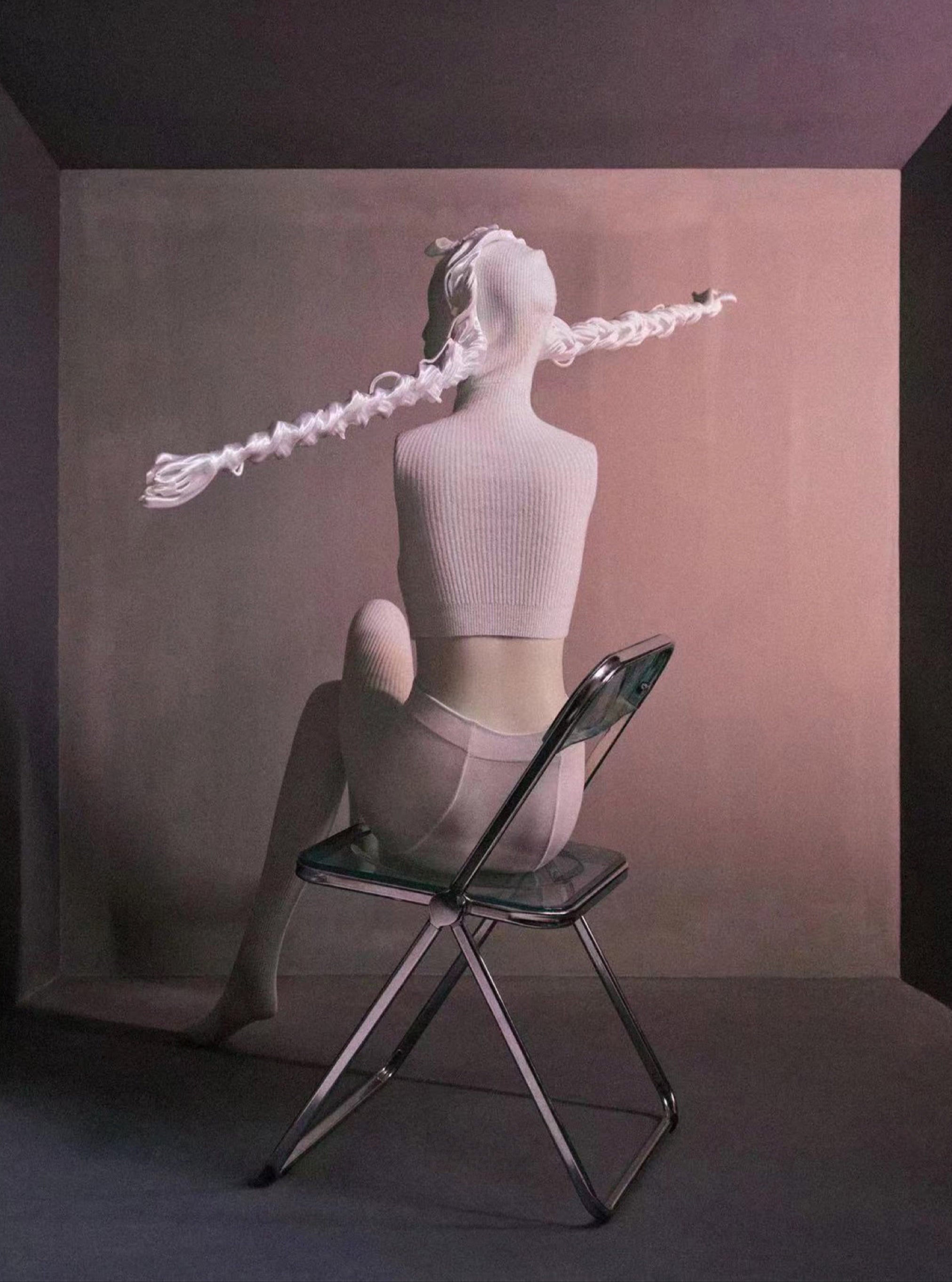 为庆祝《T Magazine》中国版创刊十周年,我们创作了一款以“一横一纵”为主题的“编织头饰”。挑战在于:“如何让假发头带在半空中笔直飘浮?” 假发结构内部的框架由碳纤维管支撑,这种材料既坚固又轻便,非常适合用作假发结构。