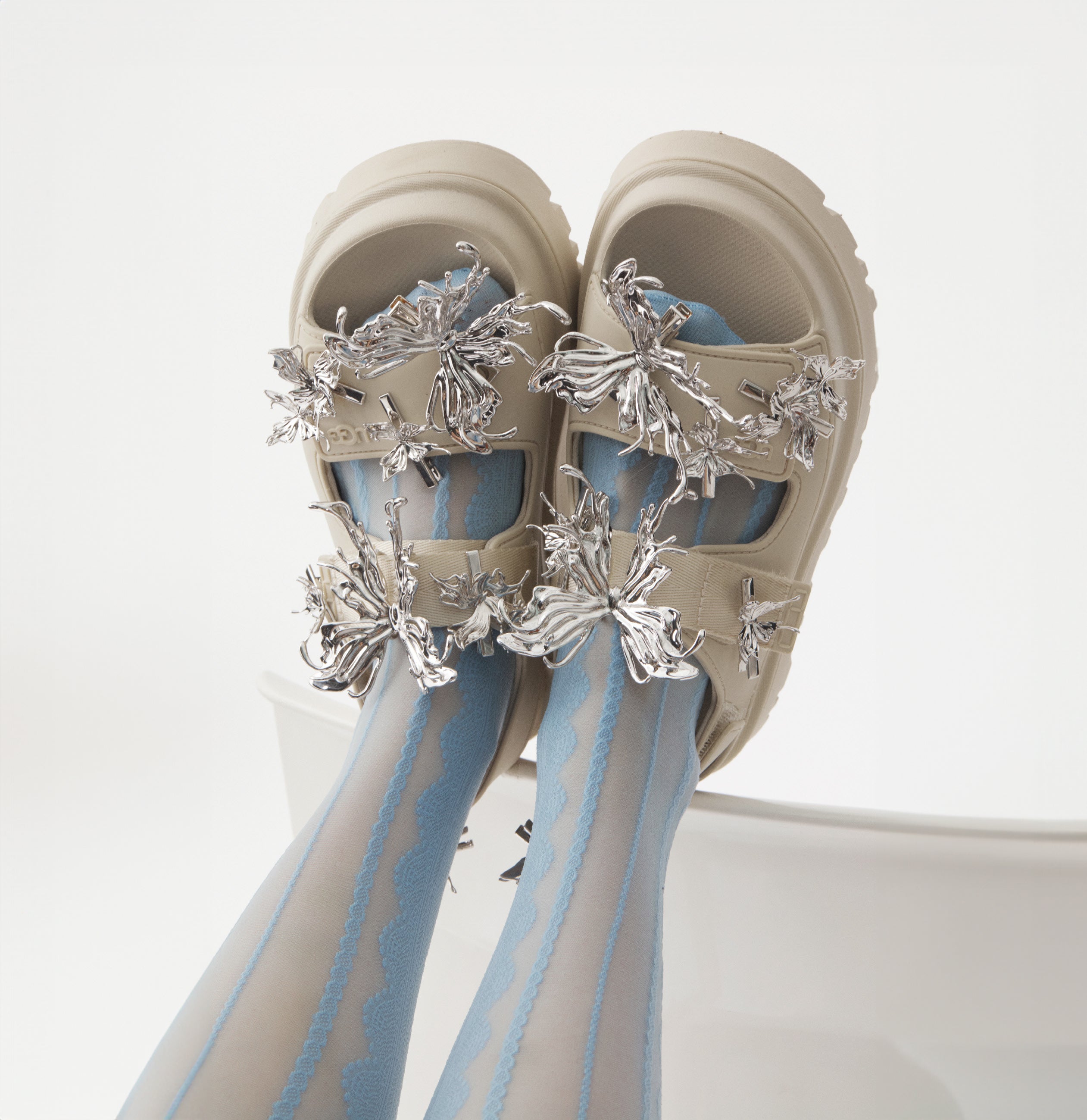 UGG 再次与 YVMIN 携手合作,推出 UGGLet——一款轻松随意、可定制的多功能鞋链。该系列将珠宝工艺和标志性材质重新融入此次合作。马鞍扣配饰的设计灵感源于“V”字到“U”字的转变。V 字上方的两个圆点延续了 YVMIN 标志性的“旋转花朵”设计。动感的珠宝增添了动感的光芒,令人联想到流转的时光,又或飘落在鞋面上的金属雪花,在 V 字到 U 字之间形成一个连续的环状。这款鞋带配饰可与各种鞋款搭配。除了作为鞋链使用,它还可以作为手链或腿饰佩戴。